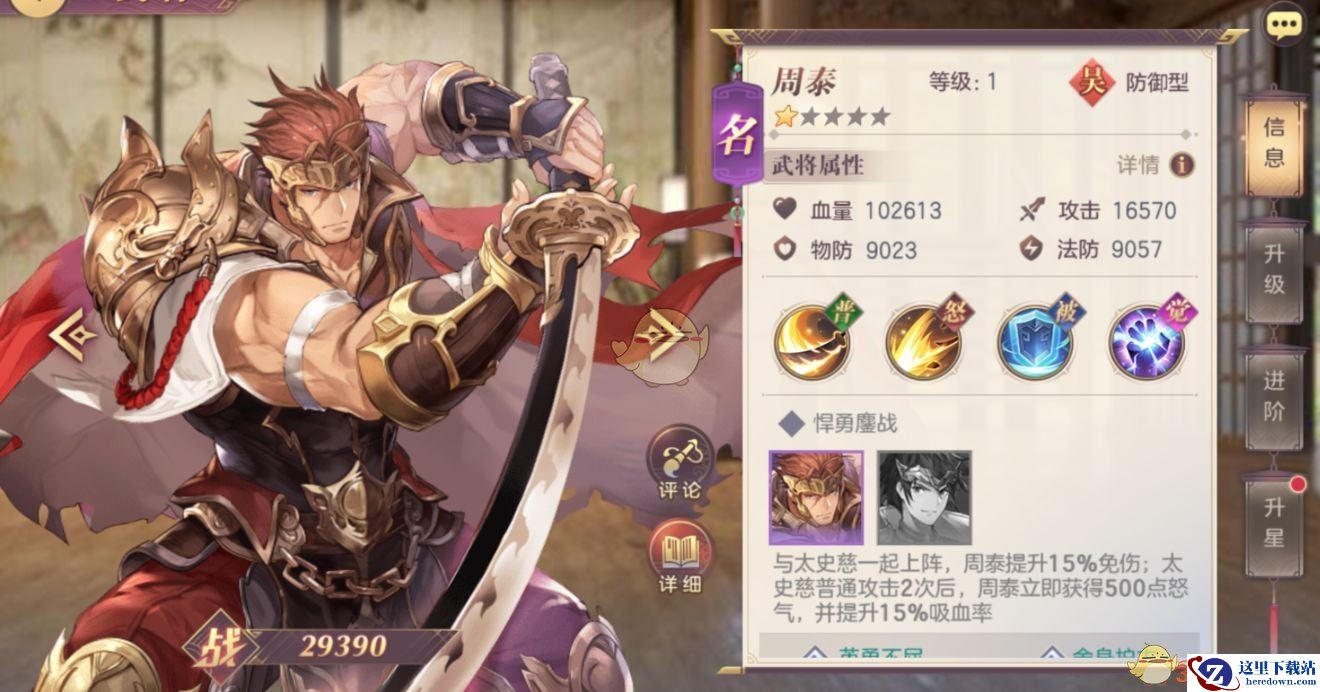 与太史慈一起上阵,周泰获得15%免伤;太史慈普攻2次后,周泰获得500点怒气,并提升15%吸血。