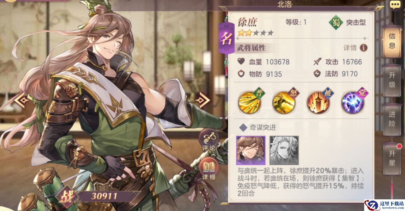 因此,如果你喜欢徐庶的话,一定要将其作为核心将来培养,如果不能活到打出第二次怒攻,徐庶的作用就无法发挥。
