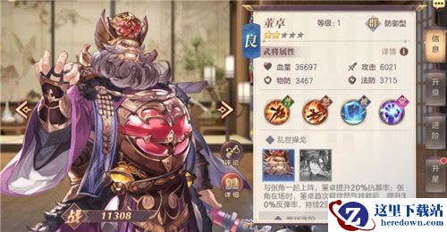 防御型武将,其技能可以给一列敌人带来154%的伤害,同时削弱对方10%的攻击力。董卓的技能减益还是相当给力的,相比较削弱10%的伤害,这个10%的攻击力要更好一些。