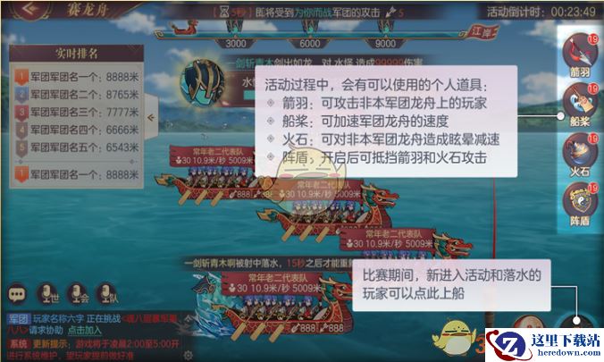 多个军团同时从起点线出发,中间会遇见水怪拦路。水怪会使龙舟减速,水怪30秒后离开,根据水怪损失的生命值会掉落道具,道具对龙舟速度产生影响,最终根据各军团龙舟到达终点的时间先后排名,并结算奖励。