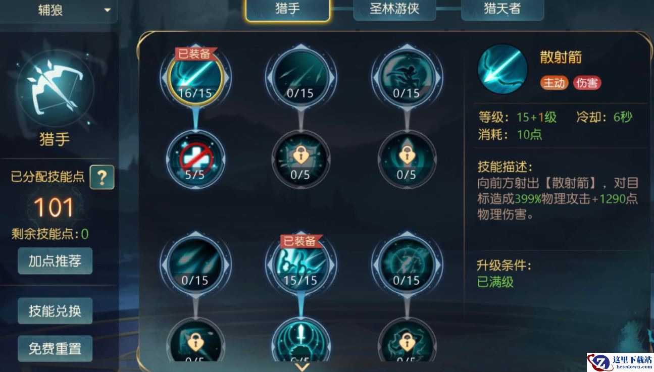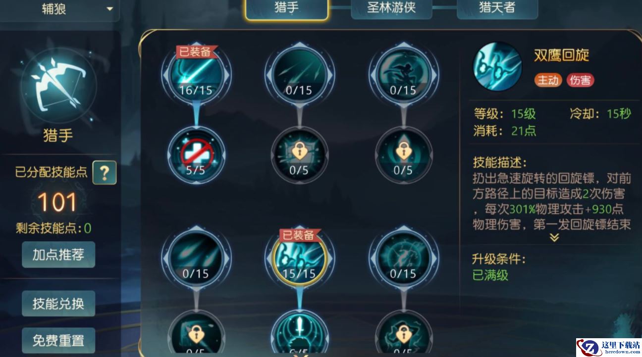 1、高配加点如图所示,适用于各种副本。核心技能狼王射击,双鹰回旋 (增伤)