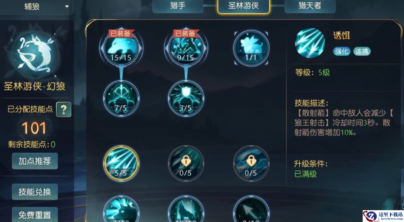 4、简单总结来说,精灵箭雨用来给狼王射击(增加暴击率)减cd,双鹰回旋用来提升穿透率,蛮狼进击用来提高防御,野性必须点满
