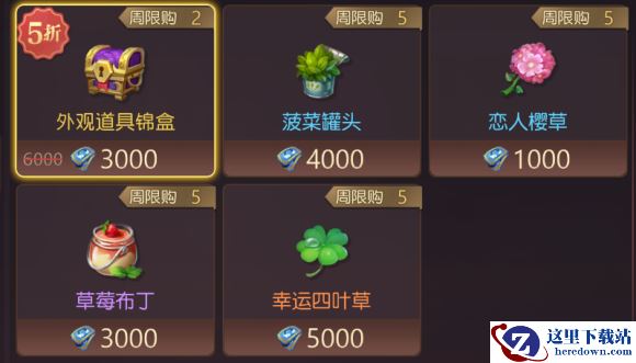 在赏金商店里,我们主要可以购买外观道具锦盒,菠菜罐头,恋人樱草,草莓布丁,幸运四叶草等。