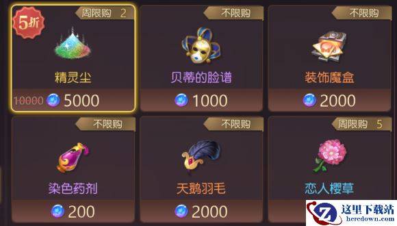 主要可购买商品:精灵尘,装饰墨盒。染色药剂等。