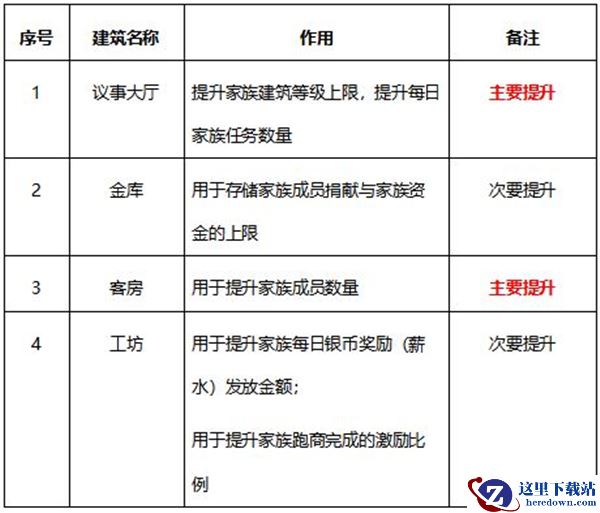 家族系统类似其他游戏中的工会、帮派,家族可使用家族成员捐献及完成任务所带来的建设资金提升家族建筑等级,并随着等级扩充家族成员数量。家族升级建筑主要包括如下内容: