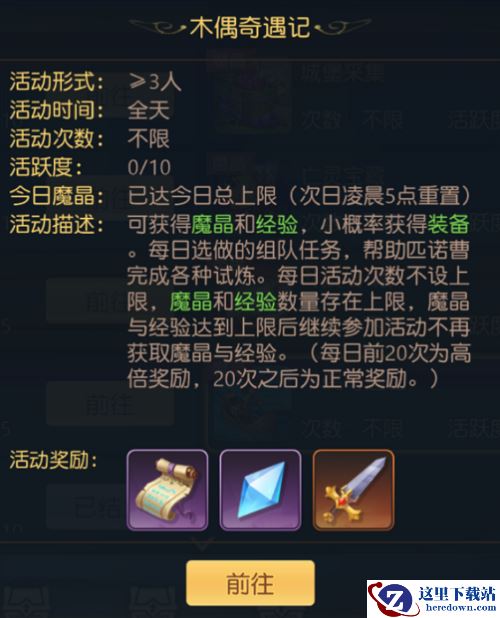 木偶奇遇记会在28级时开启,需要组队三人以上才可进入,全天可以进入且没有次数限制,但是每天可获得的活跃度是有上限的。