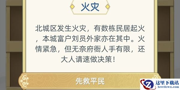 北城区发生火灾,有数栋民居起火本城富户刘员外家亦在其中。火情紧急,但无奈府衙人手有限,还大人请速做决策!