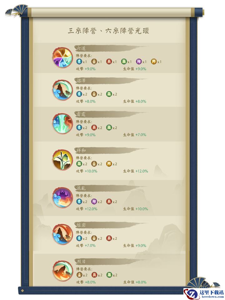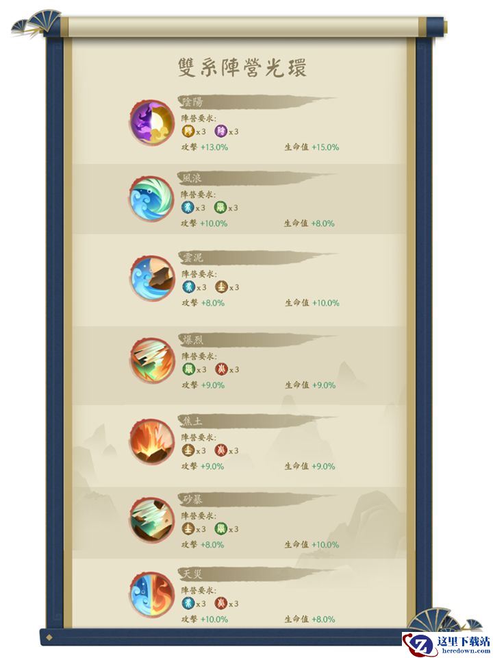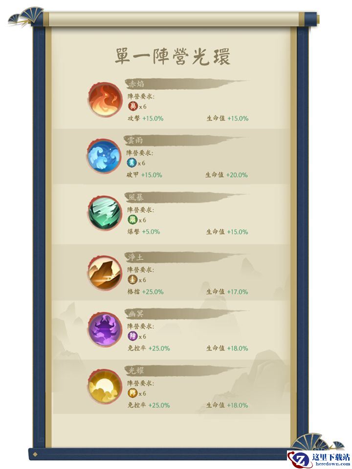 根据上阵的指定英雄阵营数量可激活光环,获得属性加成,各光环加成不一致,光环凑齐难度越高,属性加成越高;