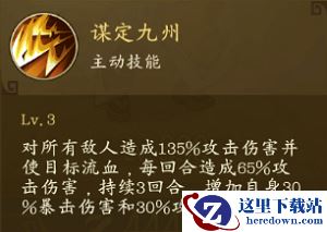 主动技能:对所有敌人造成伤害并附带Debuff流血,持续3回合,并且增加自身暴伤和攻击,主动技能除了是全体伤害外,和其他英雄相比并没有出众的地方