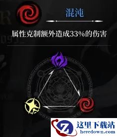 魔女们有三大属性,混沌、光耀、暗影,三者按顺序构成一个轮回式的克制三角,用克制的属性去攻击敌人,将获得33%的伤害加成。