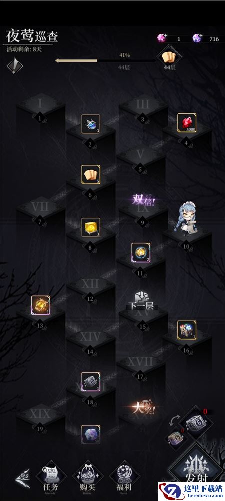 那我今天自己的层数来说。今天是第6天,我已经走了36层,现在在37层,然后我花了2000那个什么晶石去买次数。