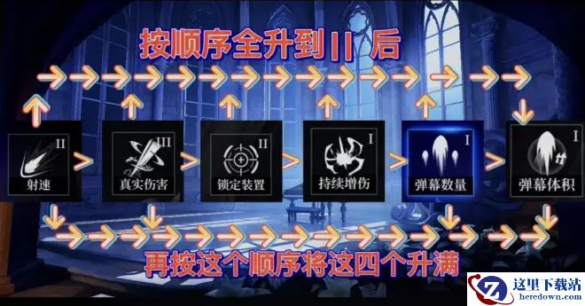 3、3级之后则按照:射速>真实伤害>弹幕数量>弹幕体积。这个顺序依次升级,循环到满级即可。