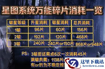 目前了解到最多玩家二破可以看到三破的消耗,因此小编将消耗列为图上的表,可以看出来一破二破翻倍的增长,三破虽然放缓但是仍然需要很多碎片, 目前可知三破最少都需要828片万能碎片。