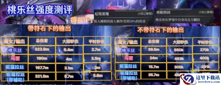 2.而与另外两个魔女对比无论是带符石还是不带符石,都比妮蔻拉丝和玛丽高很多。就算带上爪妹和冰女辅助的妮蔻拉丝伤害也没能超过桃乐丝只能说是接近,所以桃乐丝带上了增伤辅助伤害只能更高。玛丽就不用说了整体星级技能对伤害提升都不高,依赖减防的辅助,而叠满三星技能也只能增伤30%,比不过桃乐丝的大招增伤离谱。