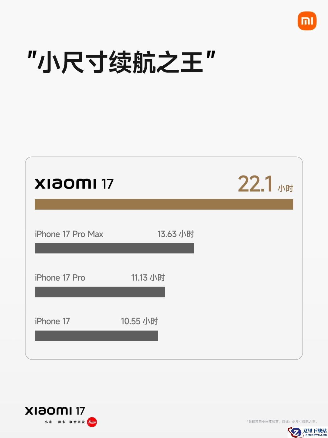 小米17标准版的续航非常夸张,搭载7000mAh电池,几乎是iPhone 17(3692mAh)的两倍,,现场PPT显示,iPhone 17外置5000mA磁吸充电宝剩余电量为0时,小米17依然剩余26%的电量。