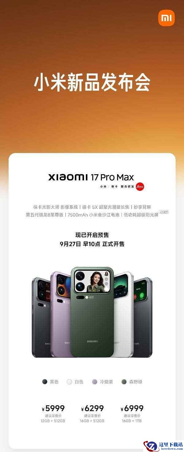 在昨天晚上的 2025 雷军年度演讲暨小米 17 系列发布会上,小米 17 Pro 系列手机正式发布,包含小米 17 Pro 和小米 17 Pro Max 两款机型,定位全能科技影像旗舰,搭载妙享背屏、首发第五代骁龙 8 至尊版,售价 4999 元起,现已开启预售,9 月 27 日 10 点正式开售。
