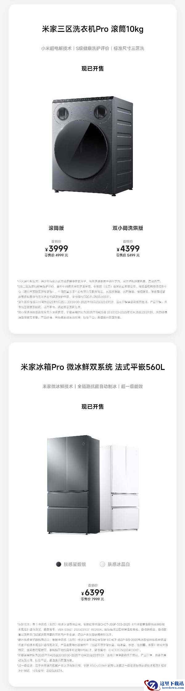 滚筒版首销价:3999元双小筒洗烘版首销价:4599元米家冰箱Pro微冰鲜双系统法式平嵌560L