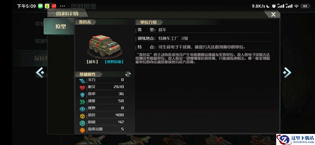 变色龙可以利用它的伪装系统来隐藏队友单位。在开启迷雾技能后,在一定范围内的友军可以处于隐身状态。变色龙本身没有伤害,但是它的作用在于战略意义。它在实战中可以隐藏自身的部队数量,在进攻时由于敌军视野的丢失,他们将无法判断我方部队的精确数量,也无法对我们实施精准的火炮攻击。