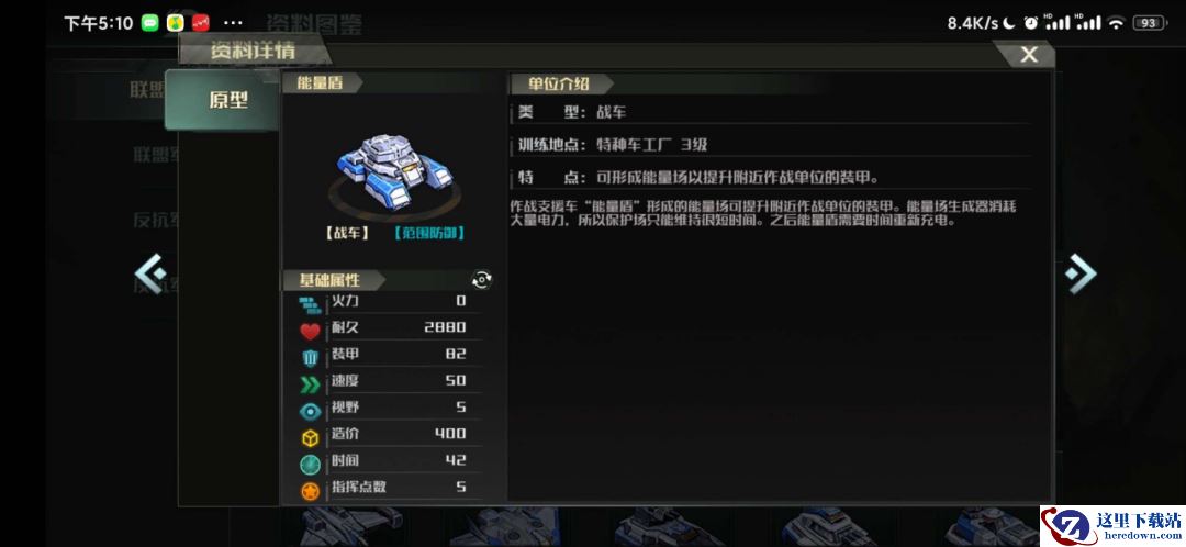 能量盾可以开启能量场来提升附近作战单位的装甲。它的作用是可以极高的提升自己单位的生存能力,可以让我方前排的坦克有更厚的装甲。能量盾本身也有着极高的装甲,在实战之中非常的坚硬不易被摧毁。