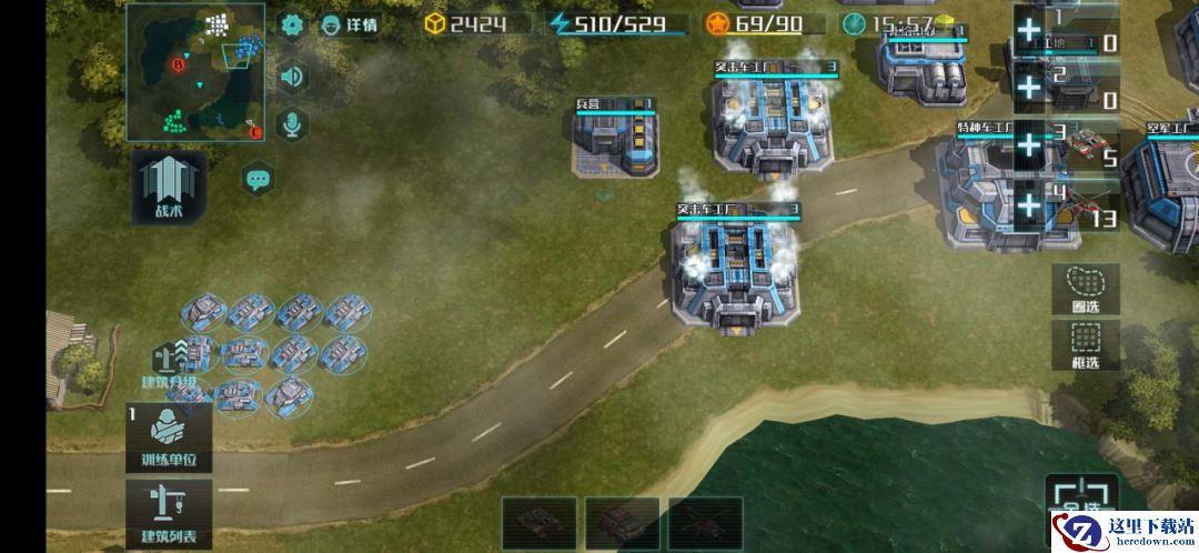 当我们在对局后期陷入了僵局,此时敌方可能有大量的防守单位和防御建筑使我们无从下手,我们可以和队友商量好共同升级三级特种车工厂,出2~3个能量盾和变色龙。