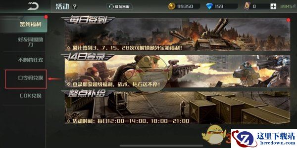 2、进入活动界面,玩家可以看见左侧的口令码兑换,点击进入口令码兑换。
