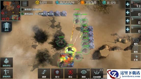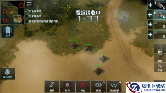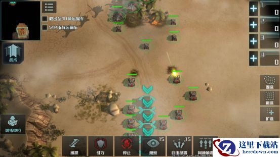 前方战火激烈,而我们更应该保障后勤工作的有序进行。此关任务为救出至少一辆运输车,在行进过程中保护所有运输车,最终安全到达前线便可。开局系统分配给我们三架直升机和数辆突击车进行守护。行进过程中我们最好将直升机分组归类,突击车同样如此。路程过半时派直升机小组前去清理对方架起的急流轰炸车,接下来便用突击车清理行进间的敌人,便可轻松过关。