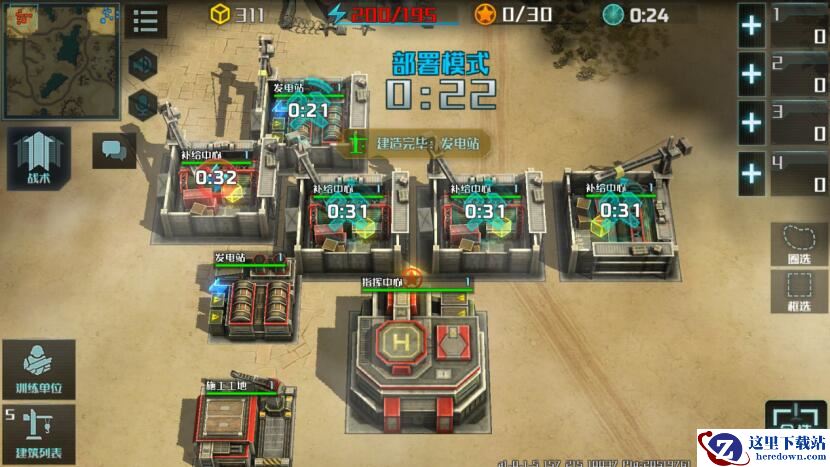 前期非常考验我们放置生产中心和发电站的速度(4个生产中心、2个发电站),建筑好后立刻在最外围建造兵营,兵营完成后应该立刻生产一级并,于此同时要在旁边建造突击车工厂随后生产一级车。