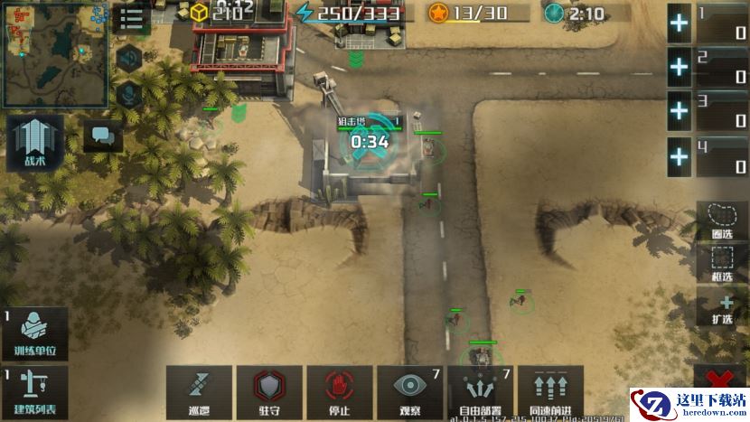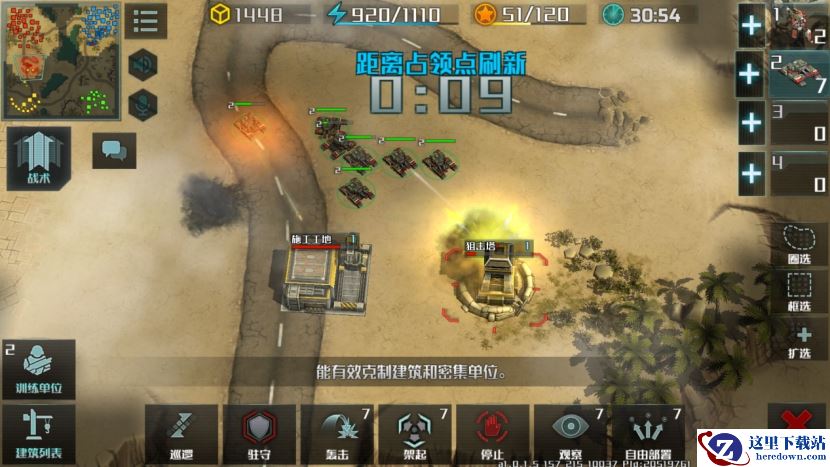 这样在第一轮资源点刷新后能保证有充足的部队前往进行争夺,站位上要注意小兵在后方,突击车在前方,因为对方如果是联盟军的话,喷出的火焰是可以大面积杀伤我方小兵,所以站位很重要。