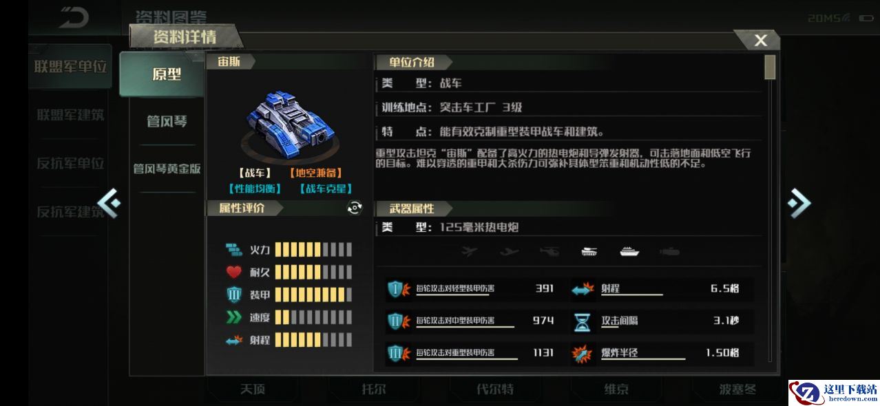 宙斯级战车可以说是游戏中最强大的陆上移动单位,强大的火力和厚实的装甲耐久让宙斯编队可以在游戏中后期横行无阻。配备的125毫米热点炮对重型装甲有着极强的杀伤能力,并且宙斯战车自带防空系统,可以有效应对低空飞行目标。但是它略显笨重,在支援能力和机动性能上表现较差,所以这一突击车的战略布局和进攻路线显得至关重要。
