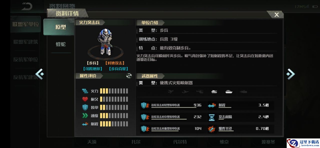 作为3级兵营兵种,火力突击兵拥有游戏中最BUG的能力:无视地形,在其喷气背包的飞跃过程中还可以无视敌方伤害!其缺点是短射程和脆皮,但是只要利用得当,火力突击兵就是敌方步兵群的噩梦。
