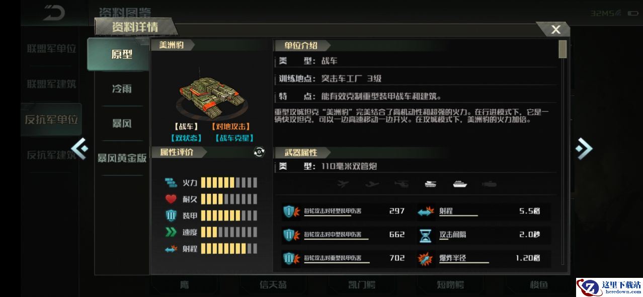 美洲豹战车拥有不逊于宙斯坦克的火力,在机动性和射程上都碾压了同级别敌方战车。并且当美洲豹架起为攻城模式时,对装甲的伤害和射程都得到极大增强。美洲豹部队在游戏中不仅可以作为移动作战的核心,在攻城战中发挥也同样亮眼,唯一的缺点可能就是略显脆弱的身板和被飞行单位单方面吊打。