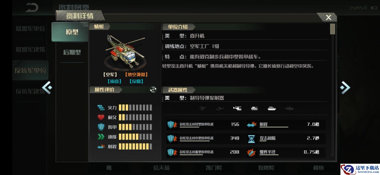 蜻蜓型直升机是反抗军侦查和突袭的法宝,作为一级空军单位的它在前期可以完美地制霸天空,同时它通过制导导弹也可以对地面中型装甲坦克单位做到有效杀伤。配合地面部队协同作战的蜻蜓型直升机兼具高性能和性价比。