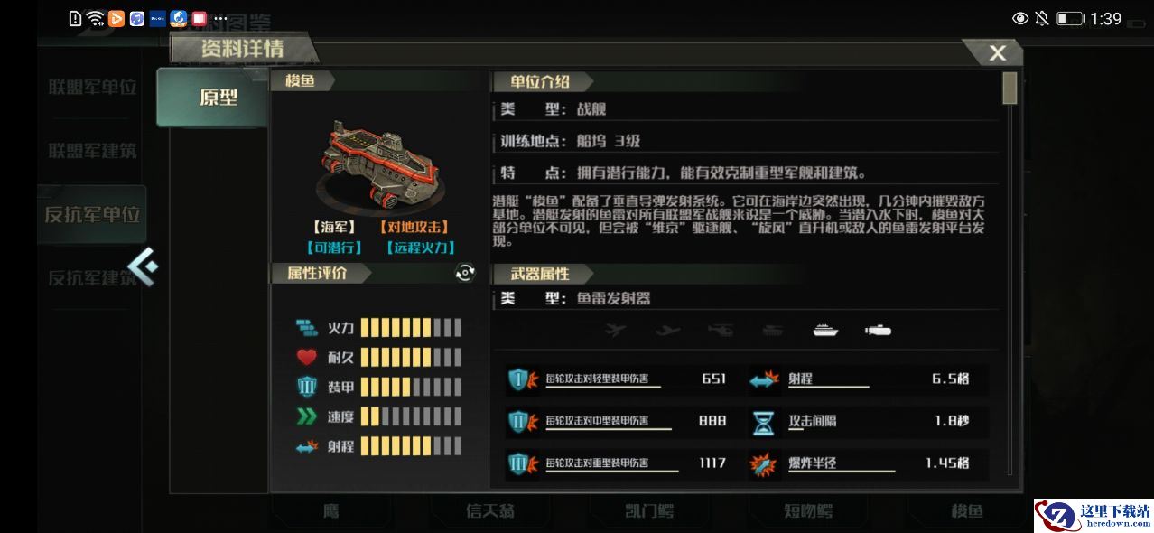 梭鱼潜艇是敌方重型军舰的噩梦,拥有潜行能力的它可以悄无声息地接近敌方海岸,对敌方基地和部队造成毁灭性打击。游戏中隐蔽梭鱼型潜艇会被维京驱逐舰、旋风型直升机和敌方鱼雷发射平台侦查到,所以在作战时要注意敌方这些单位的靠近。