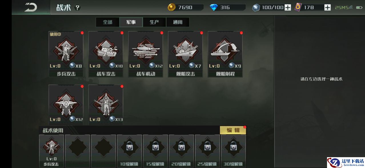 军事类战术总的来说就是提升战斗能力,其中“步兵攻击”、“战车攻击”、“舰船攻击”、“空军攻击”和“全军攻击”这五种战术直接提升单位的伤害。而“战车机动”提升战车移动速度,“舰船射程”增加舰船攻击范围。