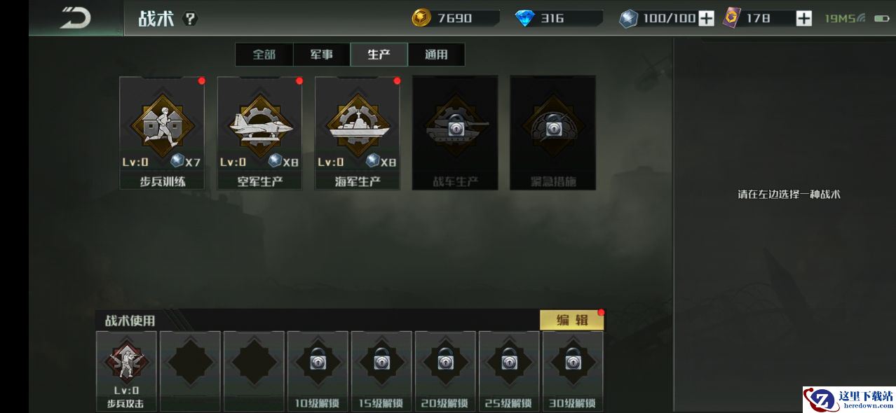 “步兵训练”和三种兵种生产战术提高兵种的训练速度,“紧急措施”战术提供建筑方面的加成,在资源不足时有奇效。
