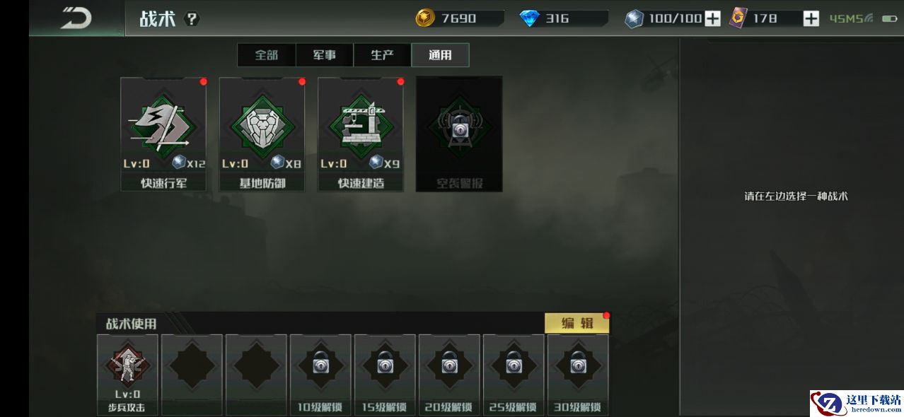 通用类战术是策略性比较强的一类,其中“快速行军”短时间内提升所有单位的移动速度,“基地防御”增加建筑护甲,“快速建造”提升建筑建造及升级速度。“空袭警报”则是通过加强防空建筑与单位,并减少敌方飞机伤害来提升防空能力。