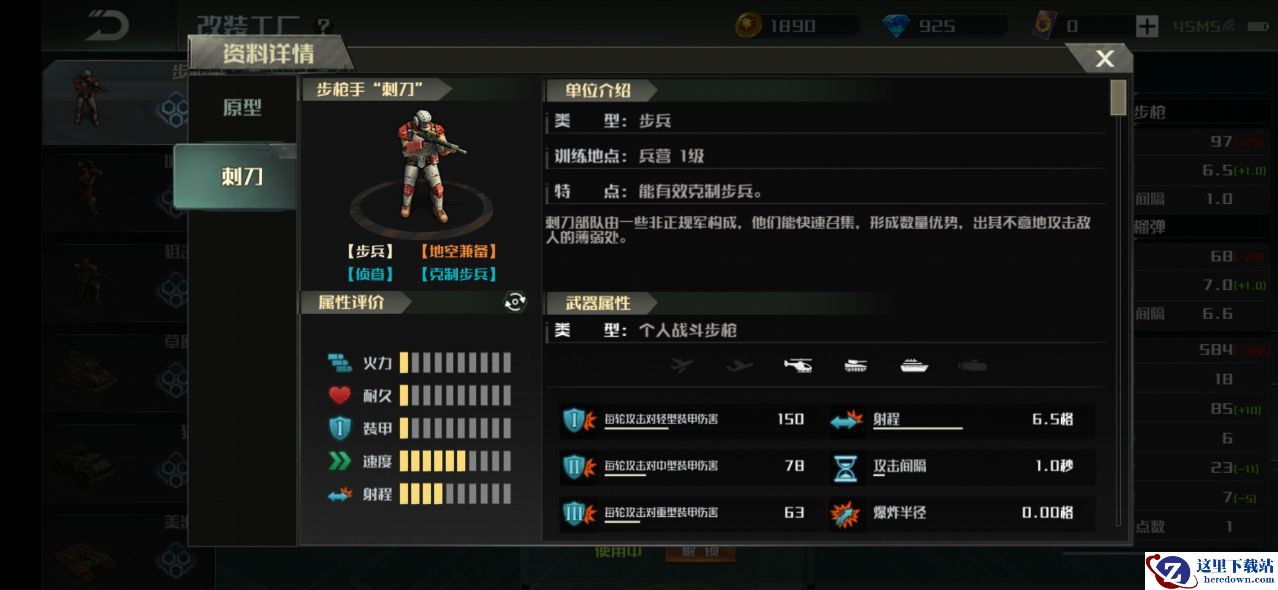 改装系统大家可以理解为战前准备,改装首先会影响单位的模型,但是可不只“换皮肤”那么简单。改装后的兵种在自身属性上会发生变化,以反抗军“步枪手”为例,刺刀相对于原版有着更低的造价和更快的训练速度,但是在作战能力上受到了削弱。由此可见,改装是把双刃剑,取舍哪一项兵种属性也成为对局前就开始的战略部署。