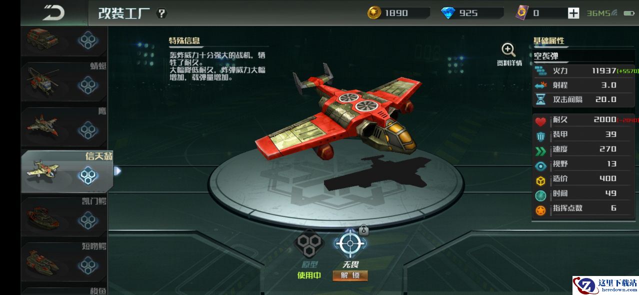但是美洲豹的这种改装,虽然用火力换取了速度,但同样创造了新的短板。游戏中除了弥补缺陷,还有发挥特长的改装思路。例如游戏中轰炸机的特点是造成远距离AOE打击,在对战中克制密集单位和建筑,但是作为飞行单位自身比较脆弱。而进行无畏形态改装的信天翁轰炸机牺牲了部分护甲性能,提升炸弹威力和载弹量,在单次的航程中可以造成更大威慑。此类改装让兵种的优点更加明显,舍弃本就不足的弱项,属于比较极端的改装方向。