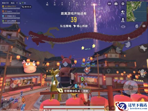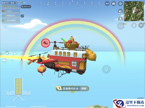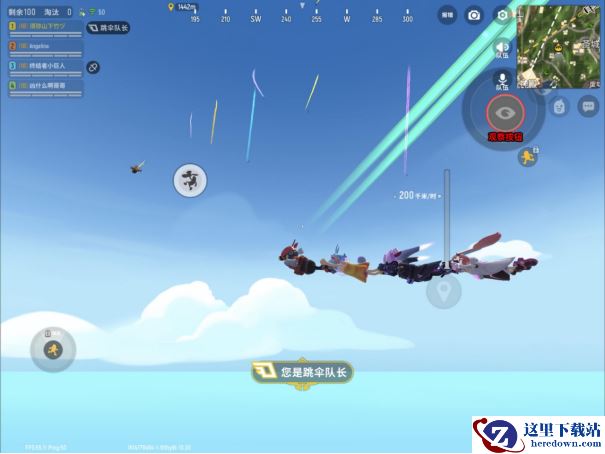 3、派对开始后,所有玩家乘坐飞行巴士飞过派对地图上空,玩家通过点击屏幕上跳伞按钮,自由选择降落地点。(跳伞前可点击右上角地图,在大地图上点击标记落点)