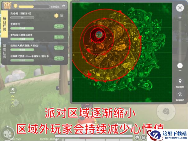 6、地图上会用“圆”标记出派对区域,派对区域会逐渐缩小。玩家需要往派对区域内移动,玩家在派对区域外心情值会逐渐降低(可使用道具恢复,清零会被直接淘汰)。派对区越小,派对区外心情值降低的越快,所以小伙伴们需要时刻留意派对区范围,尽快的抵达。