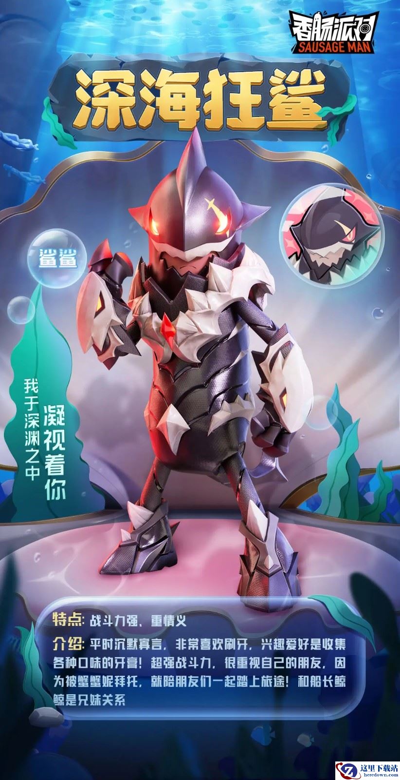 香肠派对是一款生存射击吃鸡类手游,游戏在SS10赛季中推出了许多的新皮肤套装,深海狂鲨就是其中之一,深海狂鲨平时沉默寡言,非常喜欢刷牙,兴趣爱好是收集各种口味的牙膏!超强战斗力,很重视自己的朋友,因为被蟹蟹妮拜托,就陪朋友们一起踏上旅途!