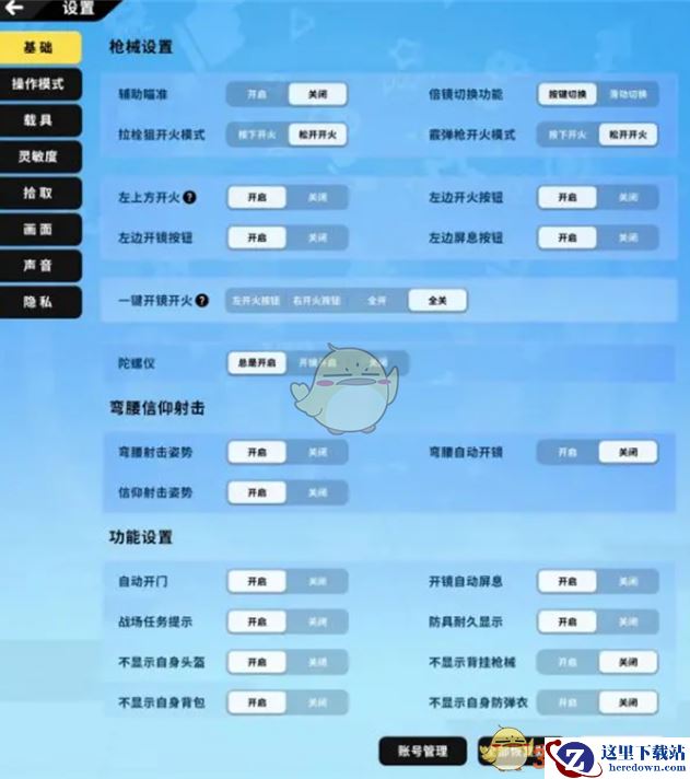 调整枪械使用习惯、陀螺仪开关、弯腰射击等功能设置。