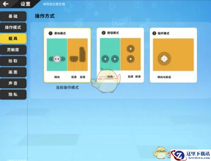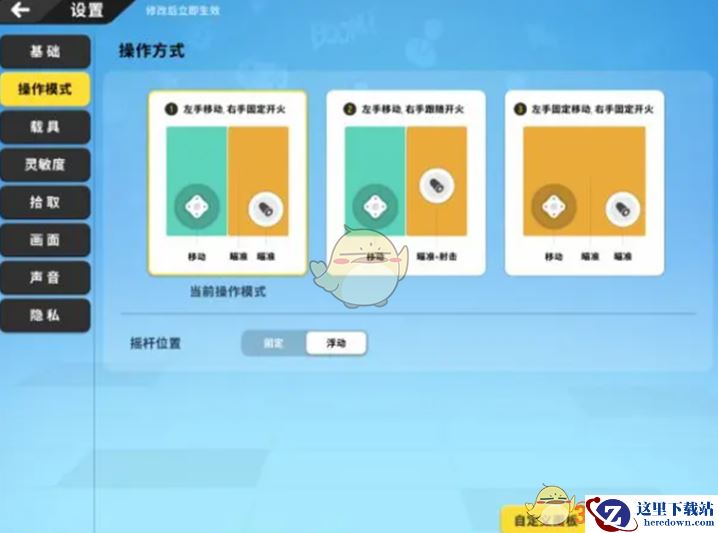 绿色区域用于角色移动,黄色区域用于瞄准。自定义操作面板支持三种方案,并可云端保存。