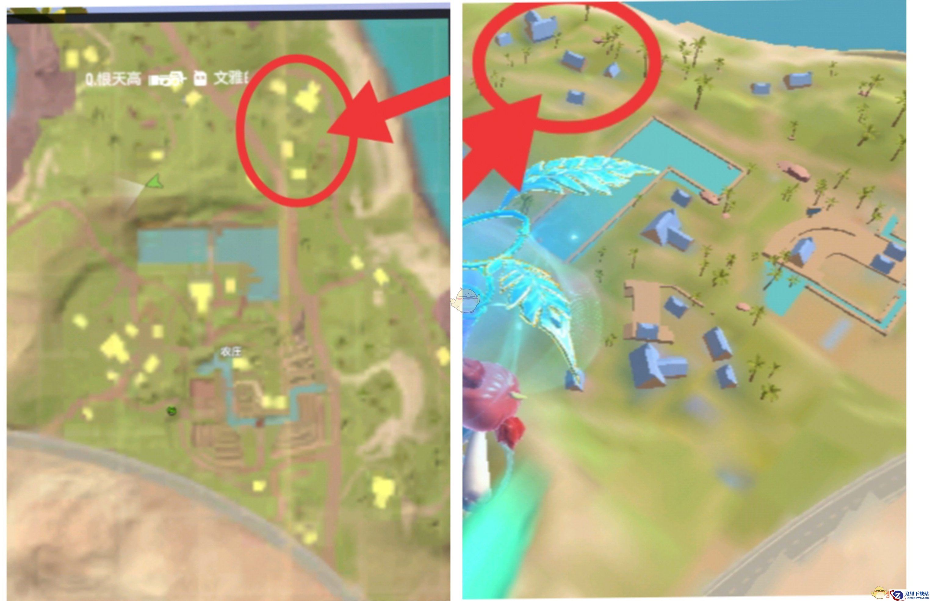 选择跳到农庄水池附近的野点房屋,这个位置能避免农庄人多时落地无枪被淘态的悲剧,同时周围会刷新车辆,人多时可以快速撤离。(位置如下图)