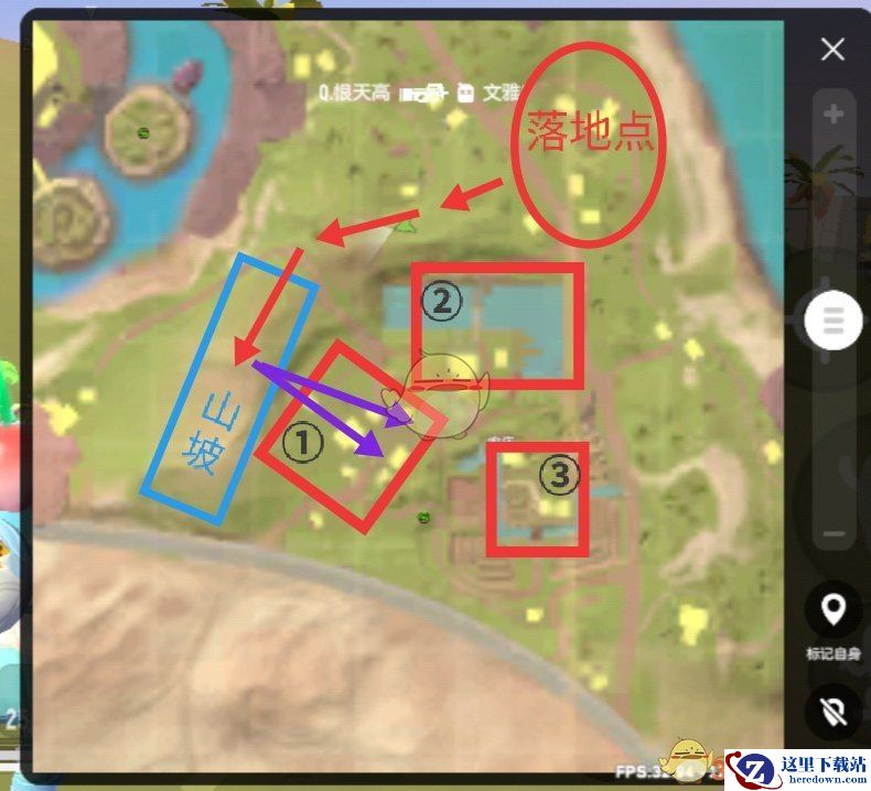 2、先跳推荐的落地点搜索物资,整备完毕后利用山坡充当障碍物摸到①号房区后面的山坡制高点(如上图红色箭头)利用高打低优势解决①号房区敌人并占领。
