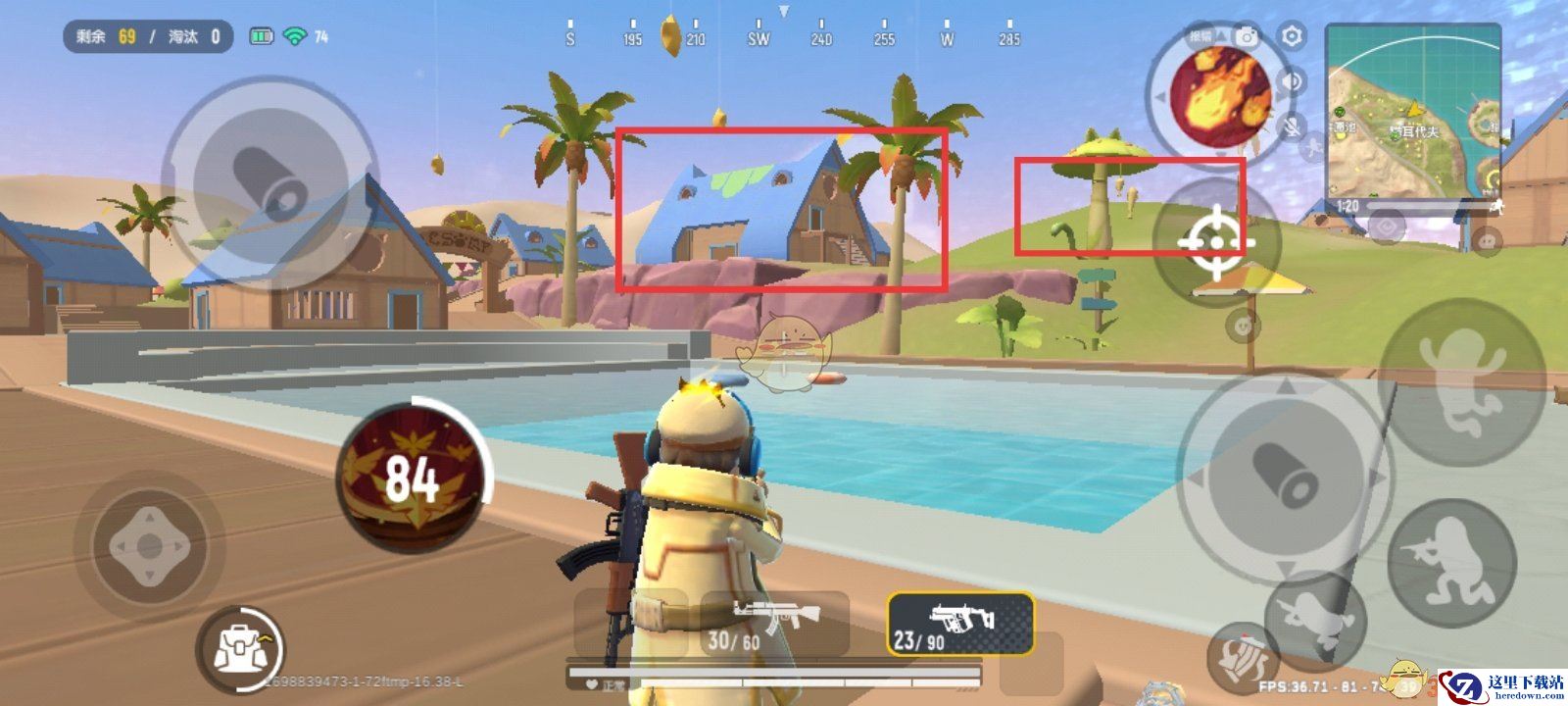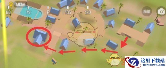 2、搜完物资后可以选择从左侧房区进攻到泳池。利用房屋作为掩体,最好不要暴露自身位置,偷偷摸摸占领左侧房区最高楼。如图红圈标记。