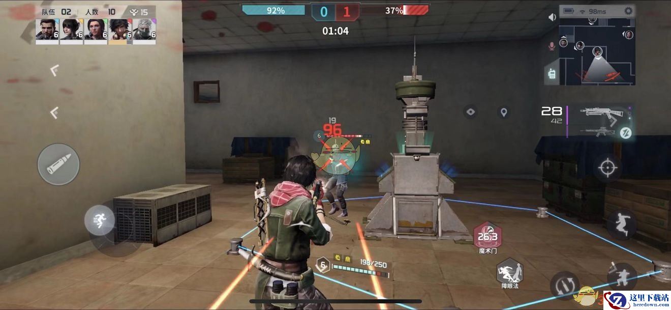 副手携带射手步枪,寻找建筑,自己在墙的外侧蹲人,队友在墙的内测等待。这时候技能的主要功能是逃生游击,见人距离较远基本就可以开打了,能打败就打败,打败不了没关系,敌方肯定会过来主动攻击你,这时候根据敌方位置远近找好时机开启一技能逃到墙的内测,这时候敌人肯定会乘胜追击,进入魔术门,然后面对他的就是两个人了,这时候2VS1,肯定胜券在握啦~