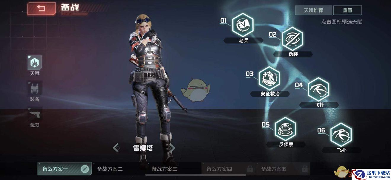 一级点老兵,二级点伪装,提升雷娜塔在前期的生存能力;三级点安全救治,增加团队生存能力;四级点飞扑,增加一技能冷却缩减;五级点反侦察,为后期的安全撤退增加保障,六级点飞扑,多增加一次技能使用机会。