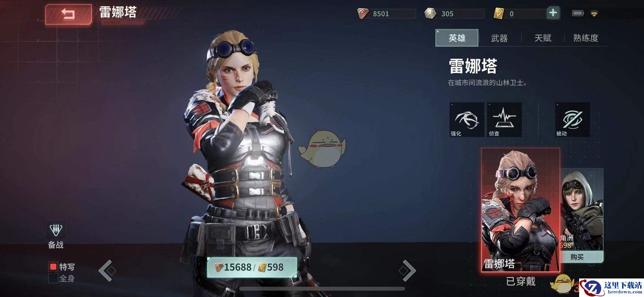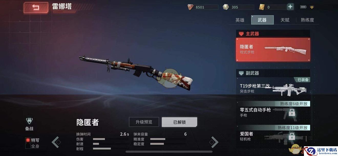 雷娜塔的默认武器都是比较中规中矩的,主武器栓动步枪弹夹量少,射速也较慢,但是只要打得准,还是可以三枪一个人的。