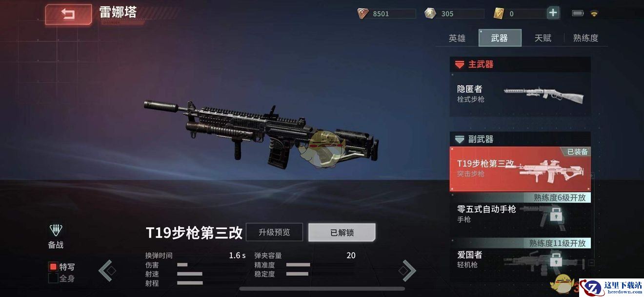 而雷娜塔主要输出就是靠她的默认副手武器——T19步 枪 第三改。虽然弹夹较小,但是其射速与射程还是不错的,而且换弹时间较短,是比较好用的。